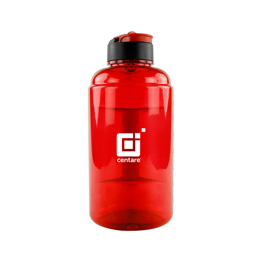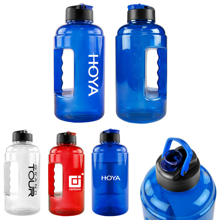 Big Bubba's half gallon water jug is perfect for university and gym giveaways. Features a side grab handle, flip up spout, and a small top carry handle. Flip up spout color matches the transparent body. BPA-Free; handwash recommended.