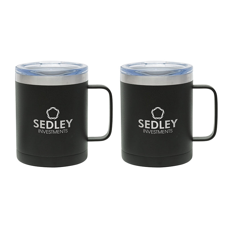 The Camper II Two-Piece Camping Mug Gift Set is the perfect gift for your camp-loving clients and friends. This gift set includes 2 Camper mugs with handles, enclosed in a medium-sized black gift box. Each mug has a 14 oz. capacity, is made of stainless steel, is vacuum sealed and double walled. These mugs have copper lining and each comes with a clear, push-in lid. Use this mug for the outdoors and it will keep your cold drinks cold for 12 hours or for the indoors as it is compatible with most .
