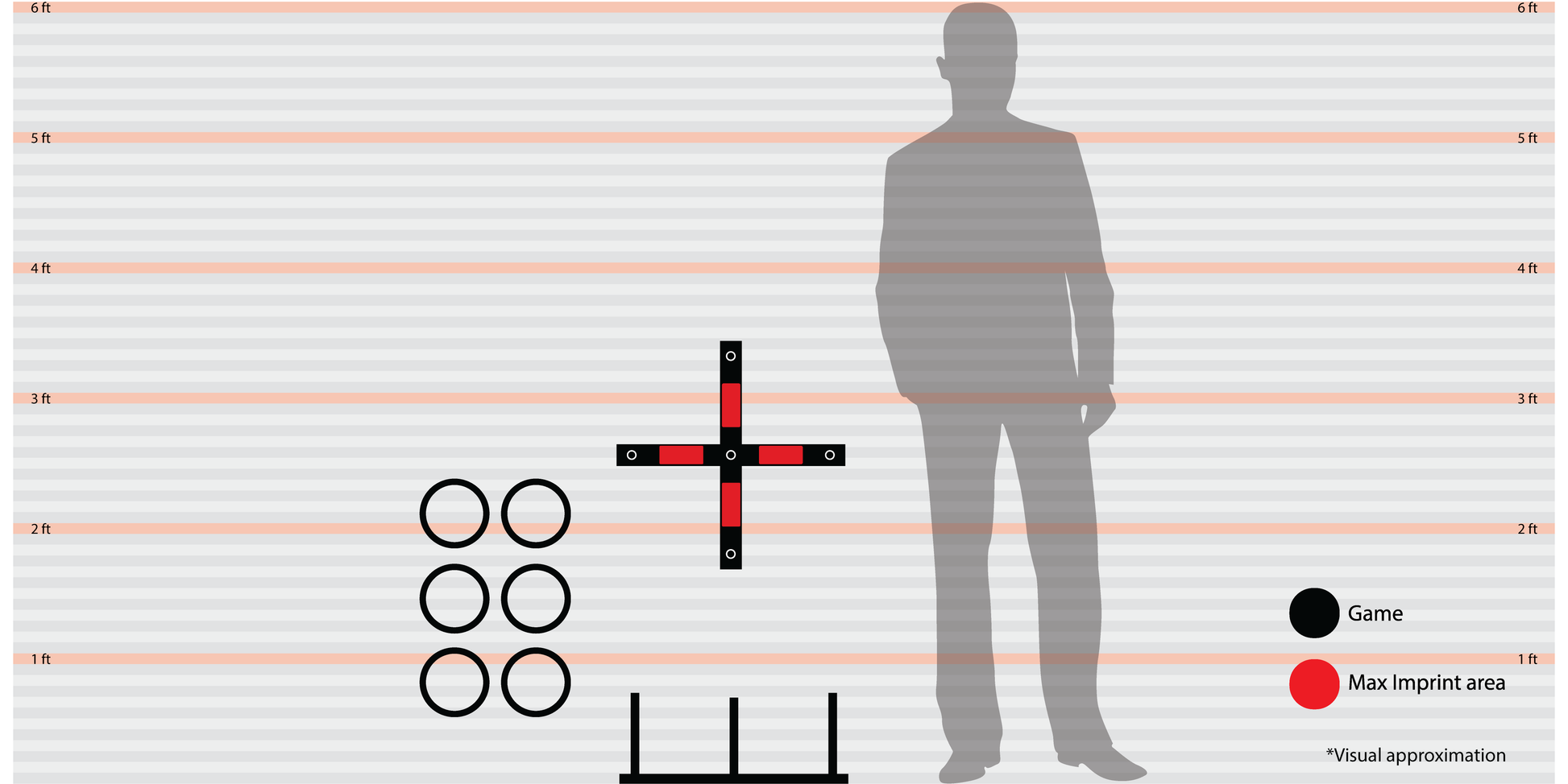 Ring-Toss game can be imprinted on all four legs, between pegs. Each rope ring (3 of each color, 6 total) measures approximately 6.5" in diameter. Art can be imprinted in 4 locations using 4 color process. Price includes 4 color printing and there is no setup fee or art charge. Imprint area is approximately 1.5"H x 4.5"W. Game dimensions are approximately 8"H x 20"W. Pricing includes 4 color printing and there is no setup fee or art charges. 18" W x 18" H x 1" D