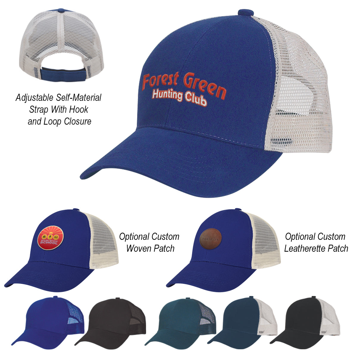 100% Brushed Cotton Twill Crown. 6 Panel, Medium Profile. Structured Crown & Pre-Curved Visor. Mesh Back With Hook And Loop Closure.