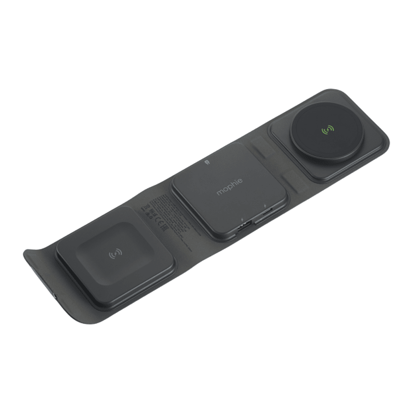 The mophie® Snap + Multi-device Travel Charger has built-in magnets that are MagSafe compatible, so your devices could snap into the ideal position for wireless charging on contact. It delivers up to 7.5W to iOS devices and up to 15W to Android devices. The designated Airpods charging spot could deliver up to 5W of power to your AirPods or wireless earbuds with wireless charging capability. You can even charge a third and fourth device with up to 10W using the additional USB-C and USB-A ports. The included snap adapter can easily attach an Qi-enabled smartphones. 30W USB-C wall charger and USB-C to USB-C cable included. All are wrapped up in one foldable travel case.