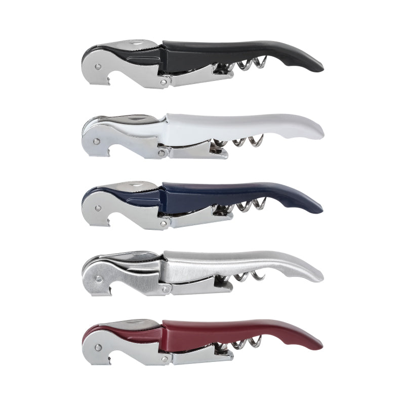 Waiter’s corkscrew with double hinged corkscrew. A customer favorite. Use it to open bottles professionally with incredible ease. Features ergonomic grip, stainless steel serrated foil cutter blade, spiral corkscrew, metal handle, and bottle opener.